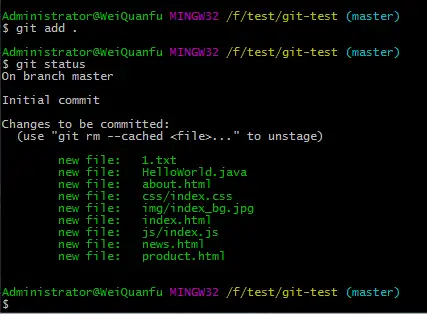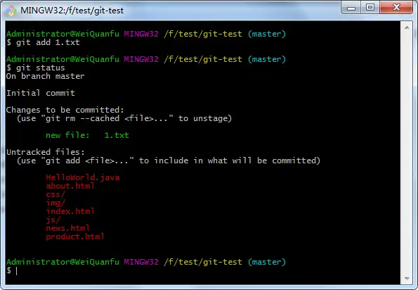 git add 1.txt 将 1.txt 文件添加到仓库,添加时要输入文件名和扩展名,windows 中 git bash 默认是不支持输入中文的,所以用这种方式不能添加以中文命名的文件,可以使用下面的方式将全部文件都添加进仓库,避免了输入文件名;