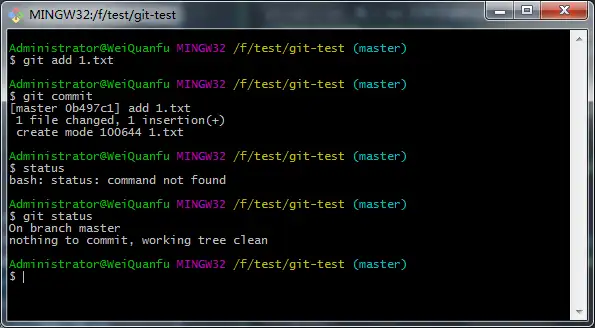 在所有文件添加完成后,我们查看仓库状态发现显示 On branch master nothing to commit, working tree clean ,就是说所有的文件修改都提交了,工作树很干净了。