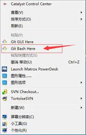 在windows安装git的同时会默认安装 git bash 插件,我们在桌面上右击鼠标就能看到 git bsah here 选项,点击后将在桌面打开 git bash 命令行工具: