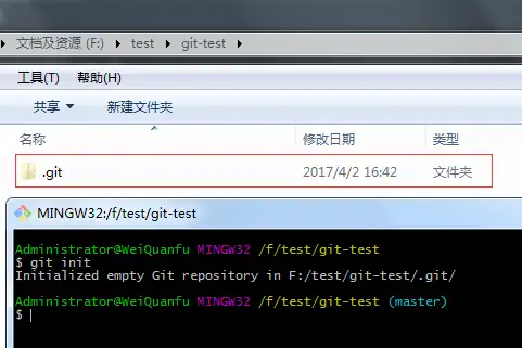 我们可以在一个空的文件夹里初始化仓库,也可以在一个用文件的文件夹里初始化,只需要我们在要初始化的文件空白区域右击打开 git bash 工具,执行 git init 命令即可,执行完成后将会在该目录下创建一个名叫 .git 的隐藏文件夹,这里面存放的是git仓库的所有信息文件。