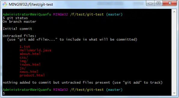 因为在用 git bash 向 git 仓库中添加文件时,添加成功时没有任何信息显示,为了查看我们是否添加成功,我们需要使用 git status 指令来查看git仓库状态: