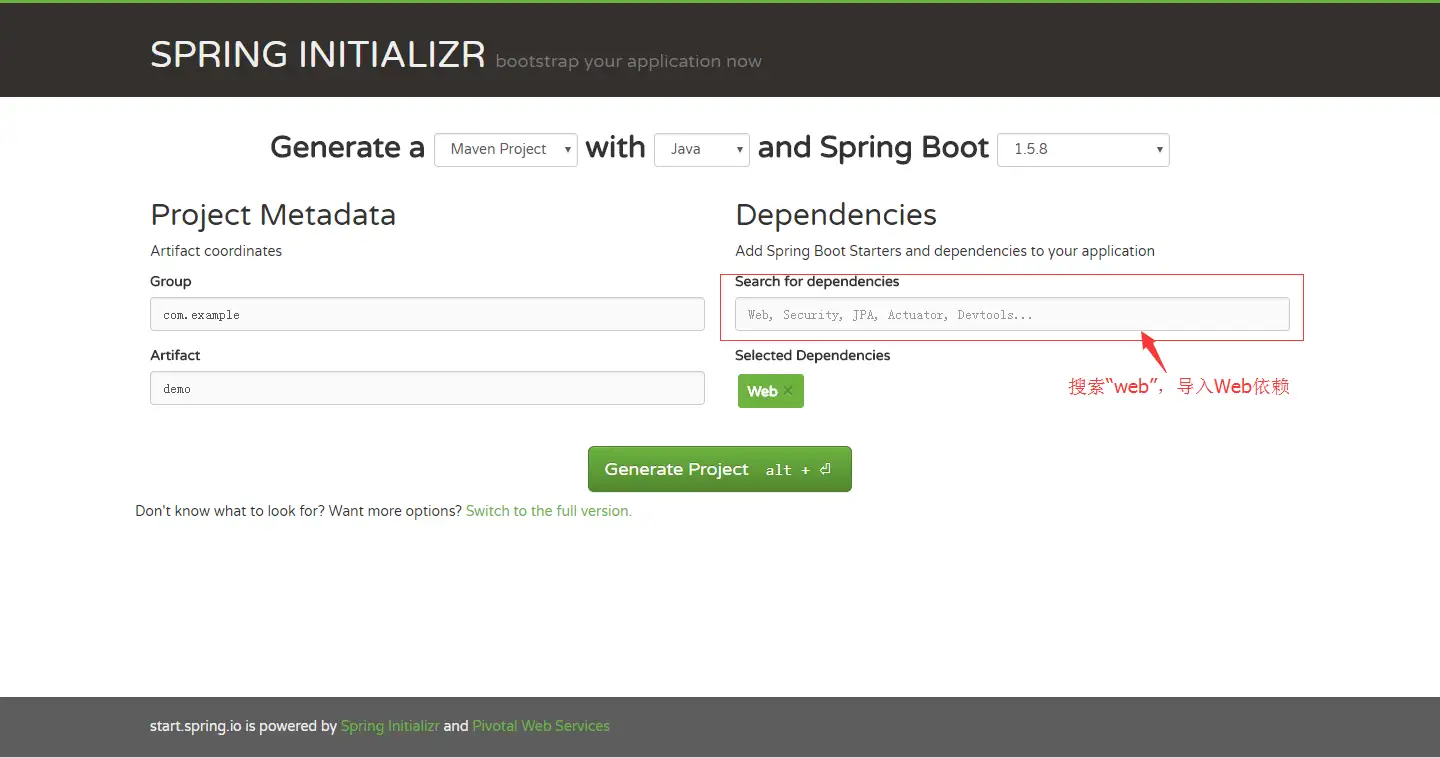 进入网站 https://start.spring.io ,填入项目相关信息及依赖,点击 “Create Project” 按钮即可将初始化完成的项目zip压缩包下载到本地