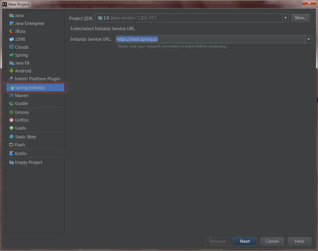 点击 Create New Project ,选择 Spring Initilizr,点击 Next