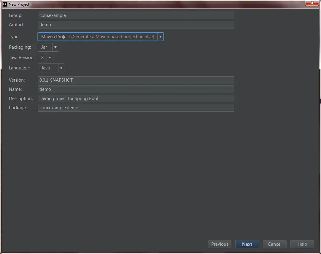 注意:这种方式实际上是使用 SpringBoot 官方提供的 Spring Initilizr 创建项目,当不使用 IDEA 进行开发时,也可直接使用浏览器访问该网站,在线创建项目。