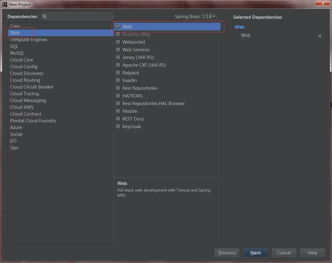选择需要的依赖,这里列出了所有可能需要的库,根据需要进行选择,选择完成后点击 Next,现在只是创建简单的java web项目体验,所以我们只选择 Web 依赖,点击 Next