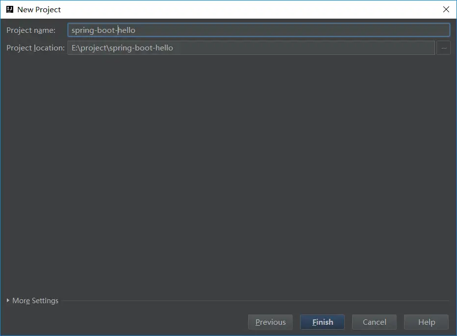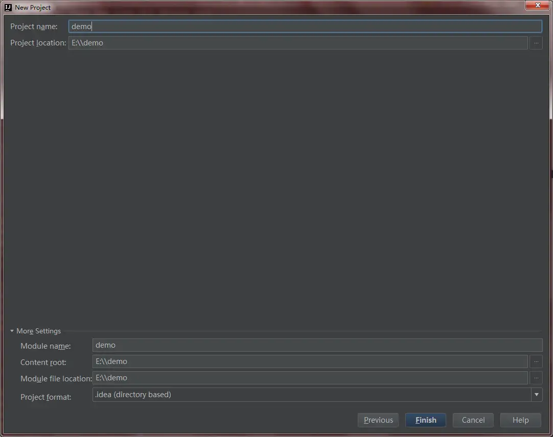 填写项目名称及存储路径,点击 Finish 完成项目创建