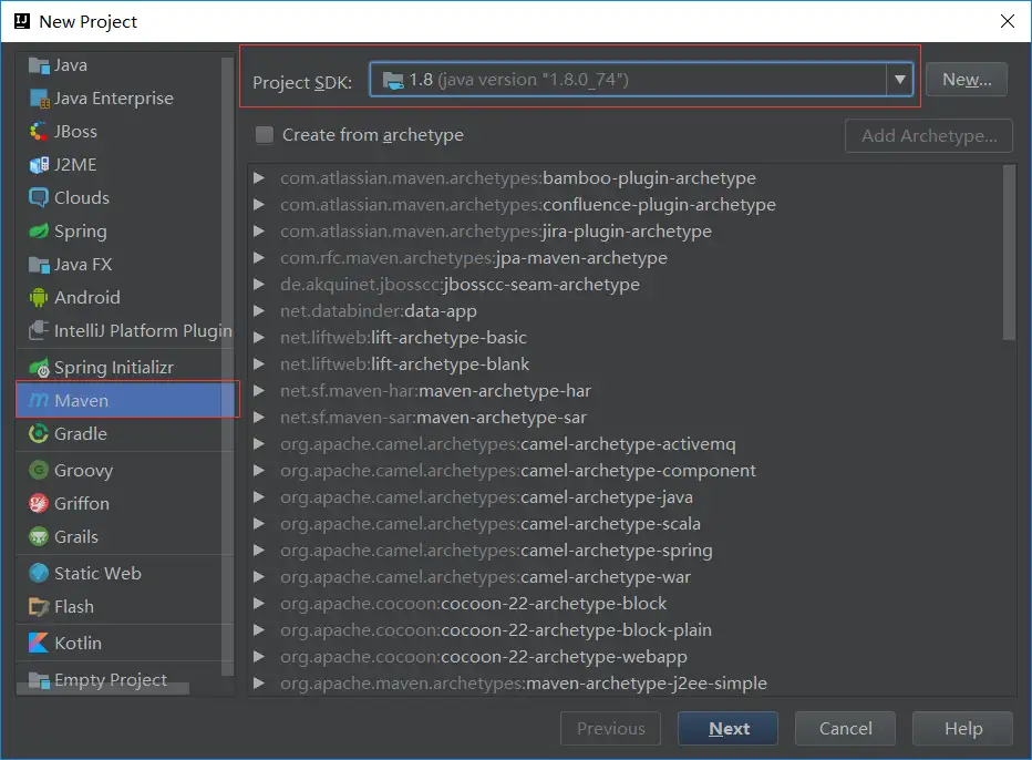 选择maven项目,Project SDK 选择 java1.8(如果没有,点击 New… 选择java安装路径),点击 Next