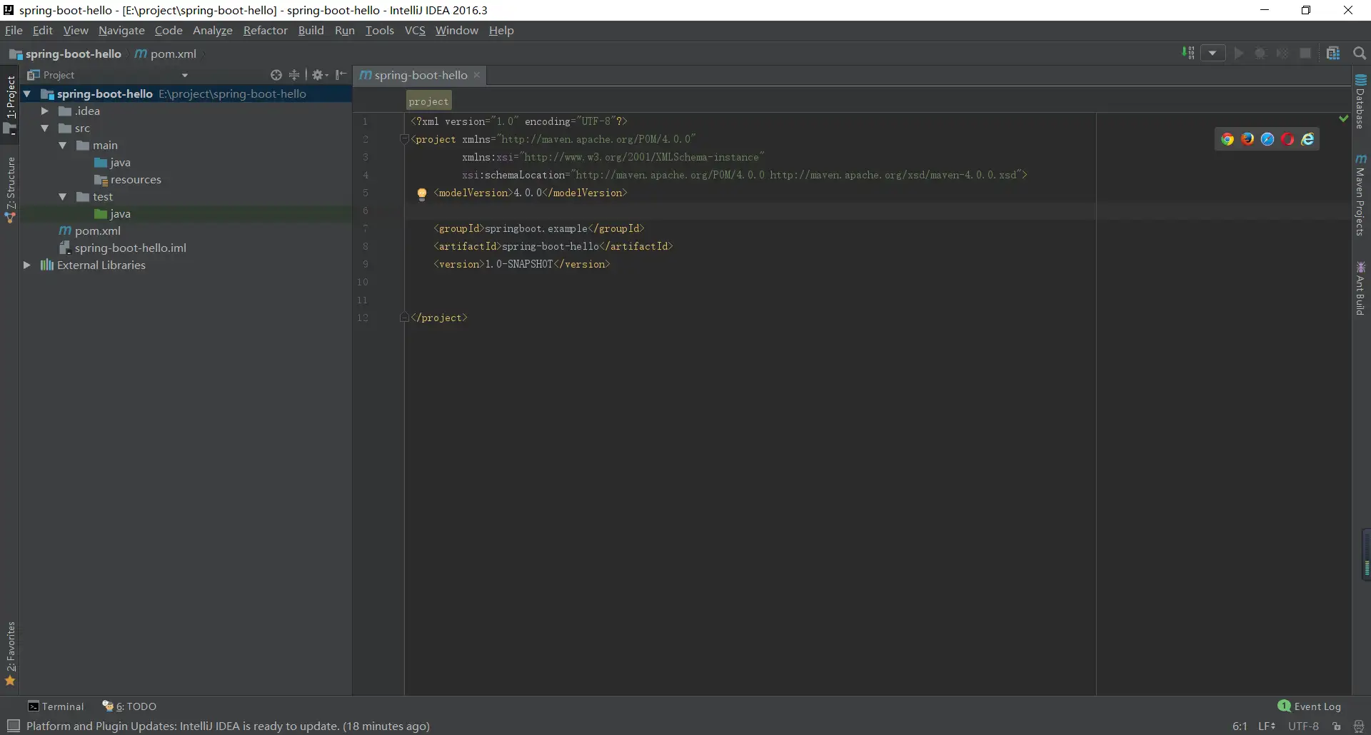 - 打开浏览器,进入 http://localhost:8080 页面,显示 Hello Spring Boot!