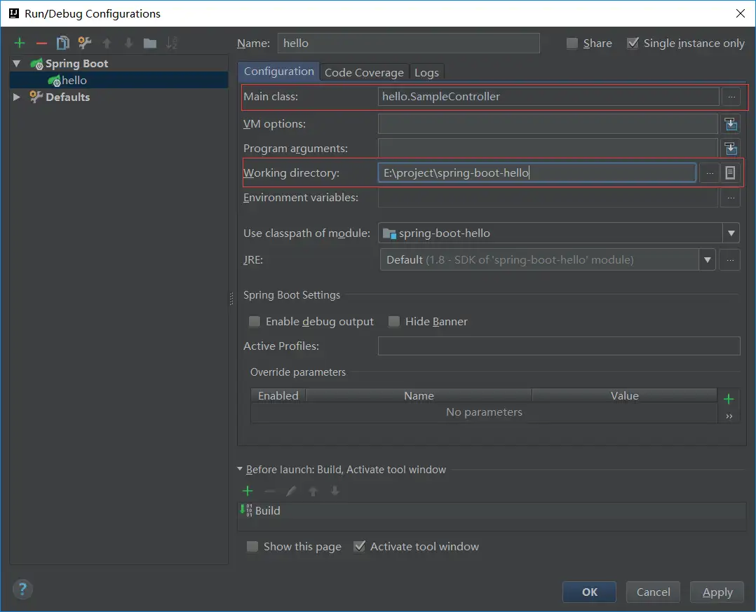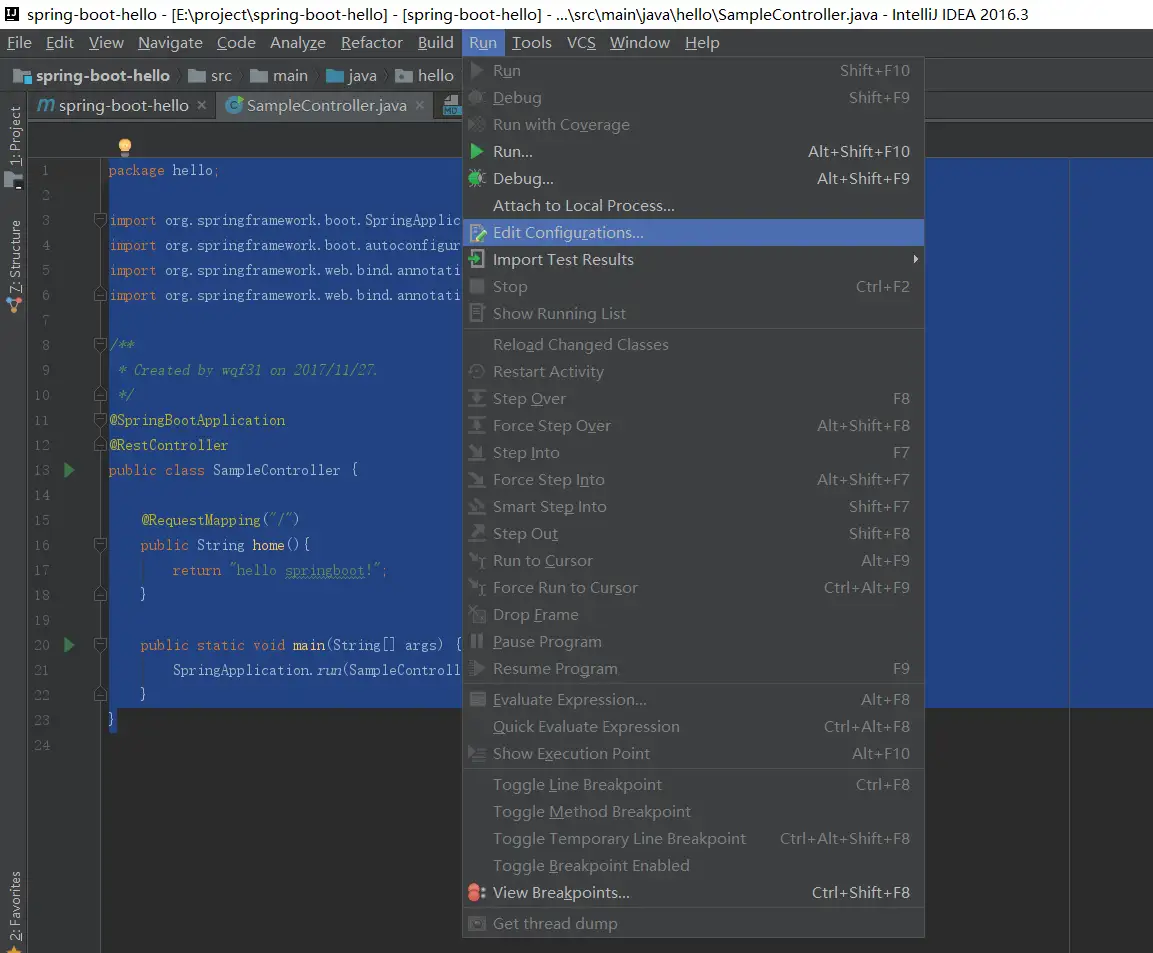 - 写一个简单的 controller 用来测试,在 src/main/java 下新建一个包 hello ,在其中新建一个java类 SampleController,其中代码如下: