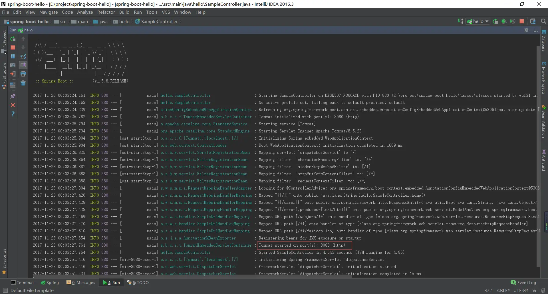spring run app.java,如果是groovy测试文件,执行指令spring run app.groovy,打出如下日志,说明已经正确启动项目