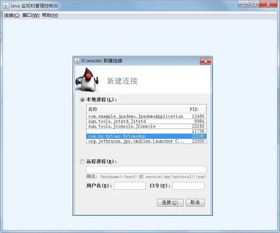 在其他机器上启动 jconsole ,使用远程连接,填入设定的地址、端口,以及用户名、密码,点击 “连接” 即可在监控远程服务器上的 java 程序。