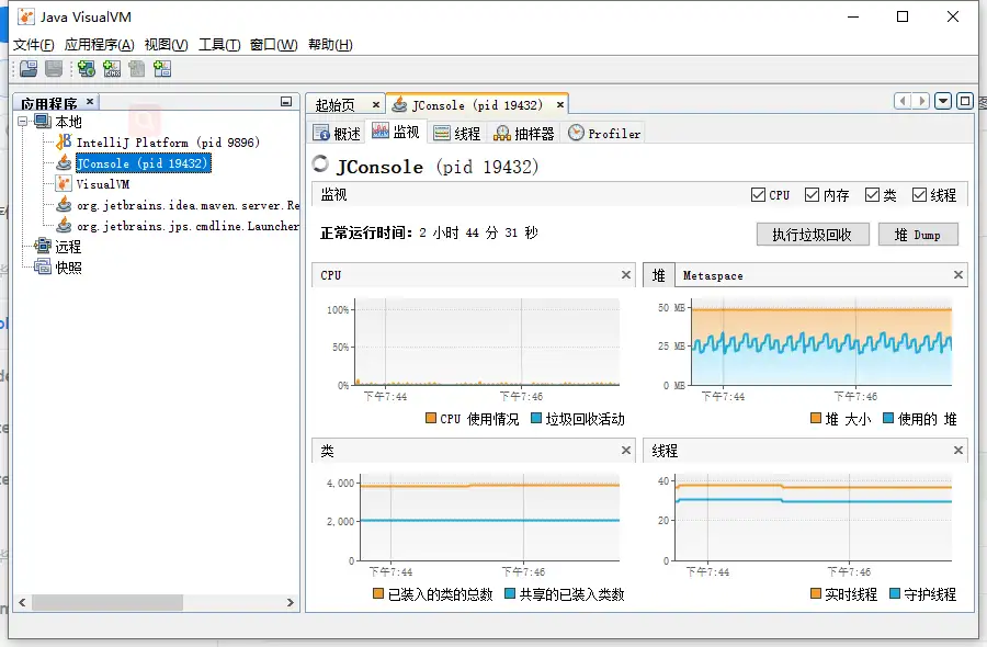 可视化操作,非常方便,可以在左侧选择本地或远程运行的 java 进程,监视效果如下: