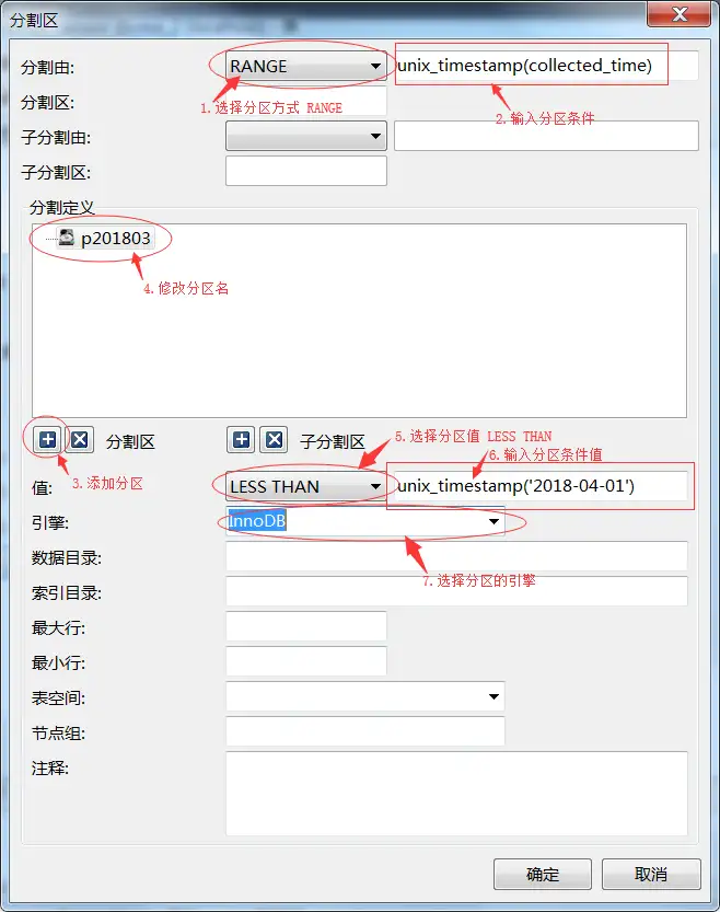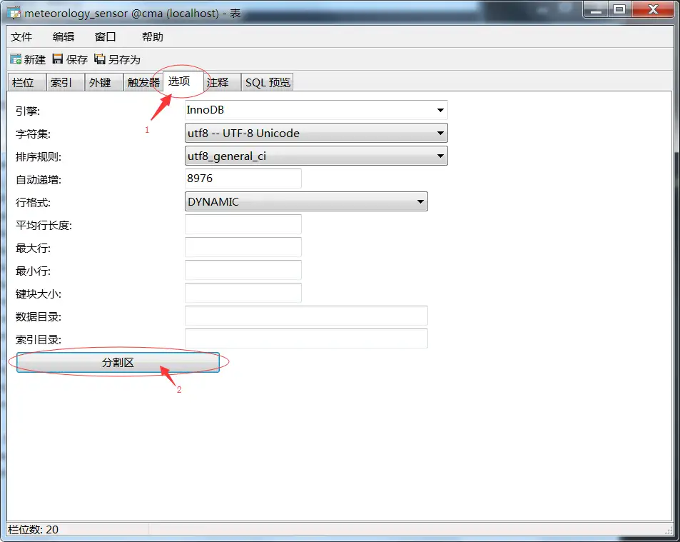 注意:这里指定字符集和数据库引擎是因为项目中需要,跟分区没有关系,也可以不指定或使用其他的。