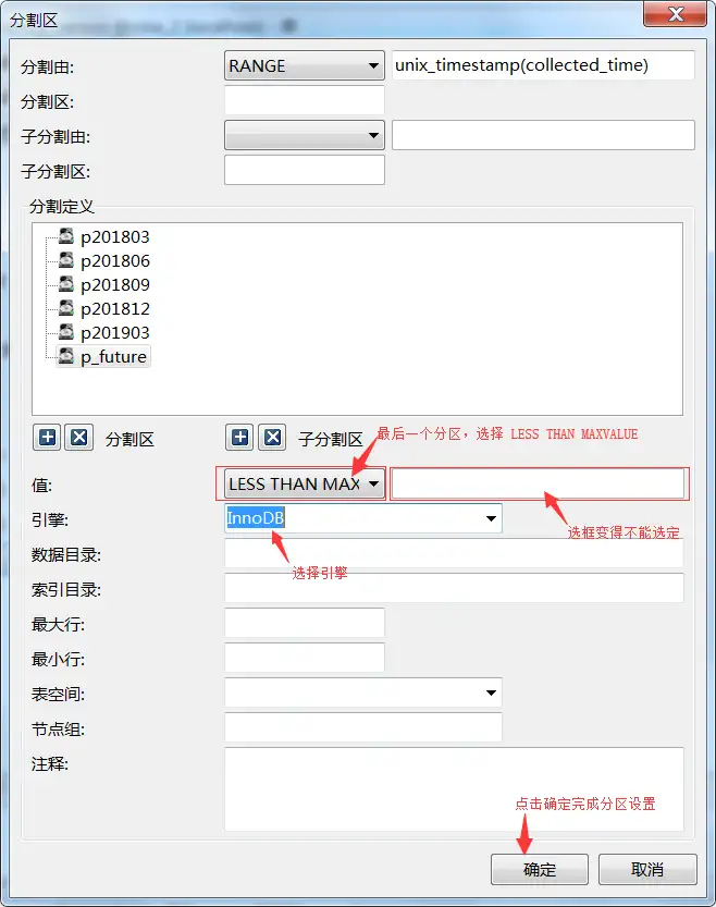 注意:最后要建一个 less than (maxvalue) 的分区(p_future),将超过设定分区时间的数据都放到这个分区里。