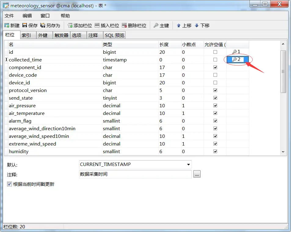 使用 Navicat 打开数据库,对表结构进行修改,将 collected_time 设置为主键。