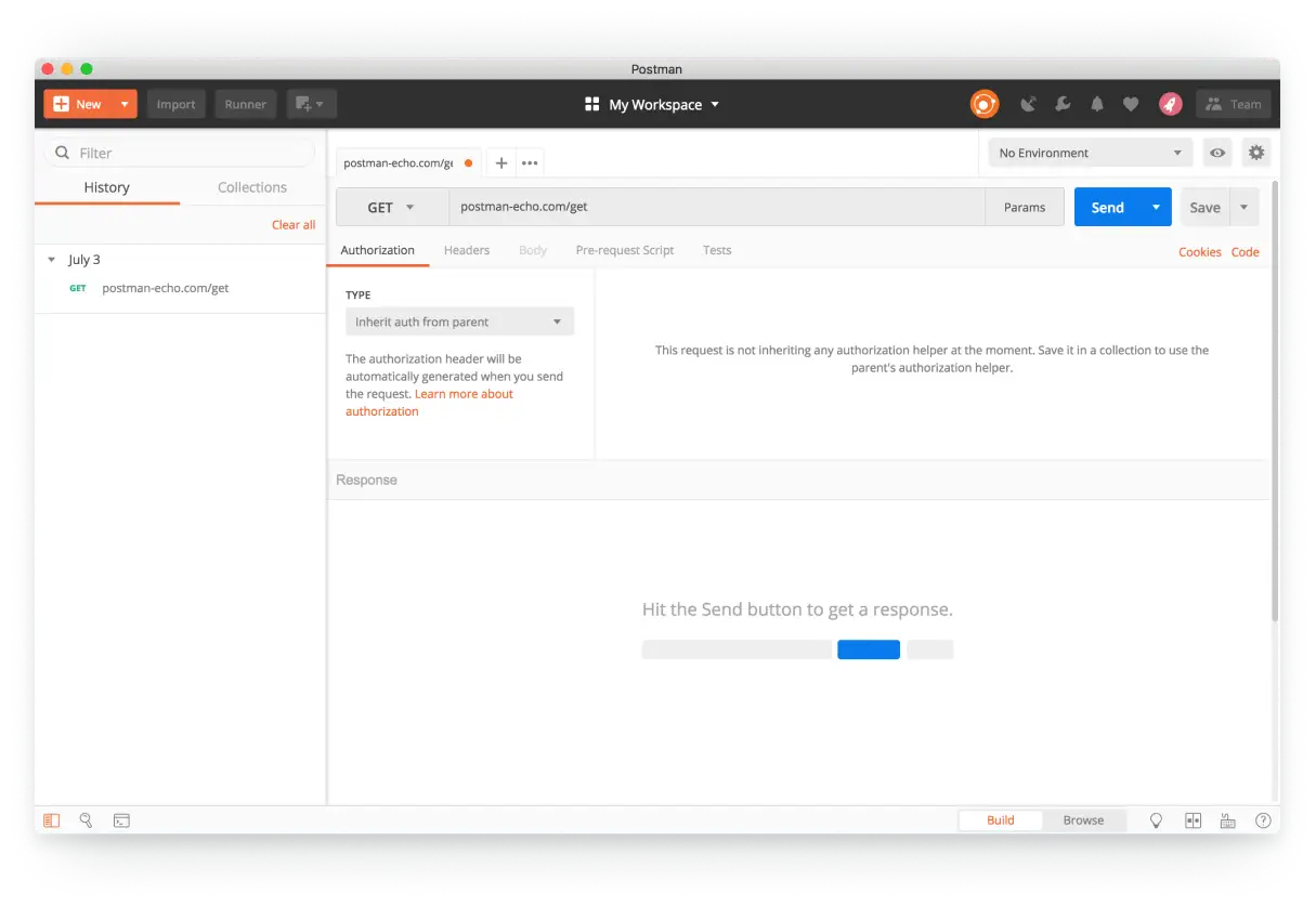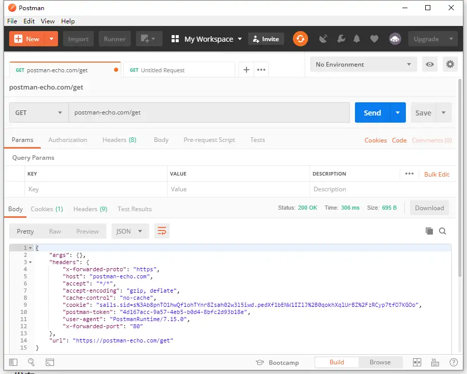 打开 Postman ,进入软件界面后,按 Ctrl + T 新建一个请求 Tab,选择 GET 方法,在地址栏中填入要请求的 api 地址,如:postman-echo.com/get ,点击 Send 按钮即可发送请求,请求成功后在下面的 Response 区域将显示请求结果,请求结果可以格式化显示。