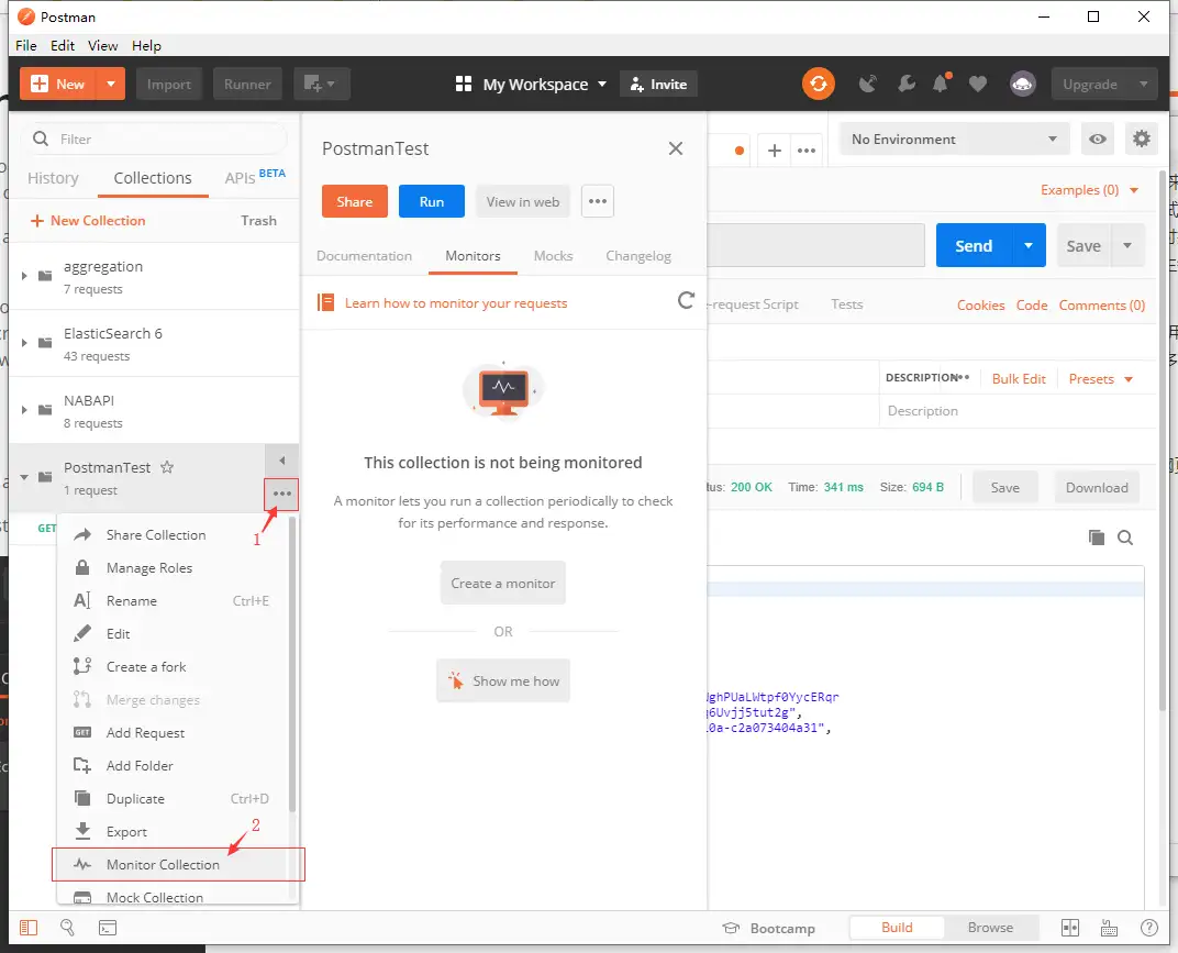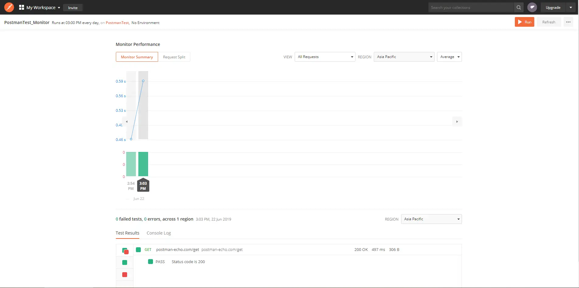 Postman 中可以设置监控器来定时执行 API 请求,用来测试接口性能和验证结果。比如设置每 5 分钟发起一次请求来测试接口是否正常启用。如果你给请求定义了测试脚本,那么监控定时指定请求时也会执行脚本来验证请求结果是否正确,如果请求发生错误将会通知用户。