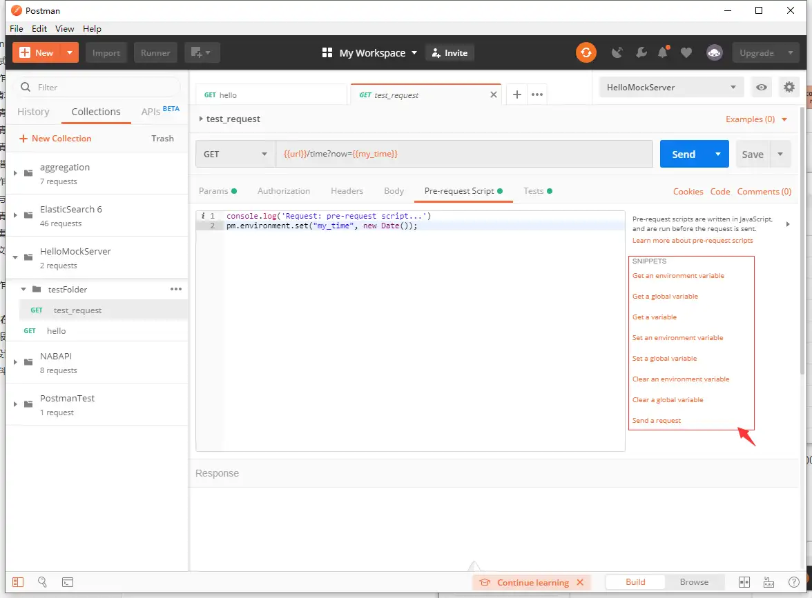 Postman 中包含了一个强有力的 Node 运行时环境,可以给请求或接口集添加动态行为。使用 JavaScript 语言编写脚本,postman 提供了一些内置对象。这样就可以编写测试套件、设置动态参数等等。在请求发起前(Pre-request script)和收到返回结果后(test script),都可以添加执行脚本,完成功能测试,执行顺序是: Pre-request -> request -> response -> test。