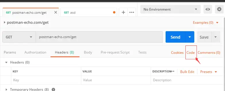 在 Postman 界面上有一些快捷按钮帮助生成代码片段: