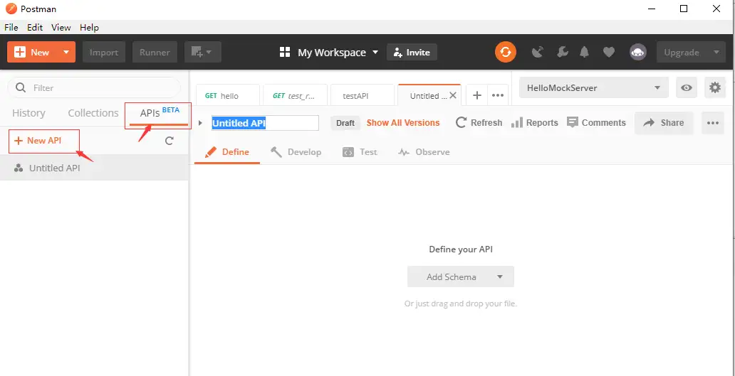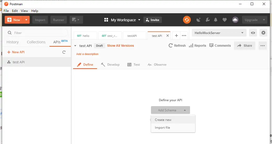 创建 API 后,需要添加定义,点击 API 显示区域中的 Add Schema 下拉选框,选择 Create new ,当然如果你有写好的定义文件,也可以从文件导入。