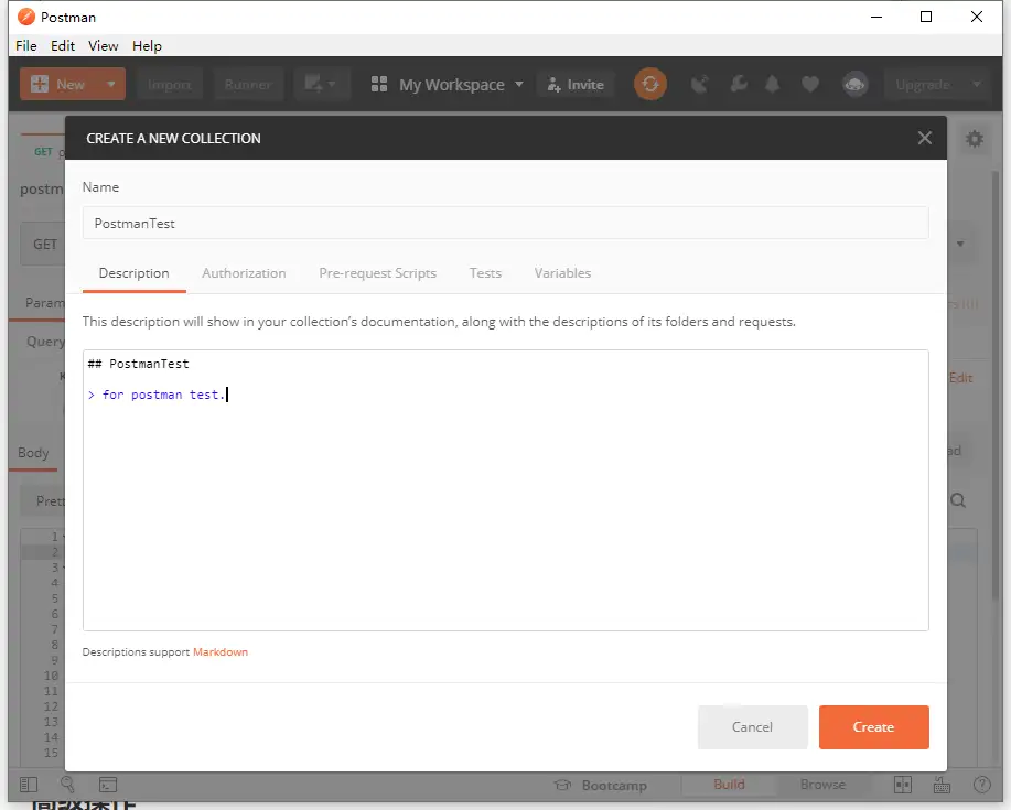 点击 File 菜单中的 New... 选项(快捷键 Ctrl + N),或点击界面左上角的 New 按钮,然后点击选择 Collection ,在新建接口集的窗口中,可以设置接口集名称、描述(支持 markdown 语法),还可以添加统一的权限,设置请求前执行的脚本和请求后的测试,添加变量。