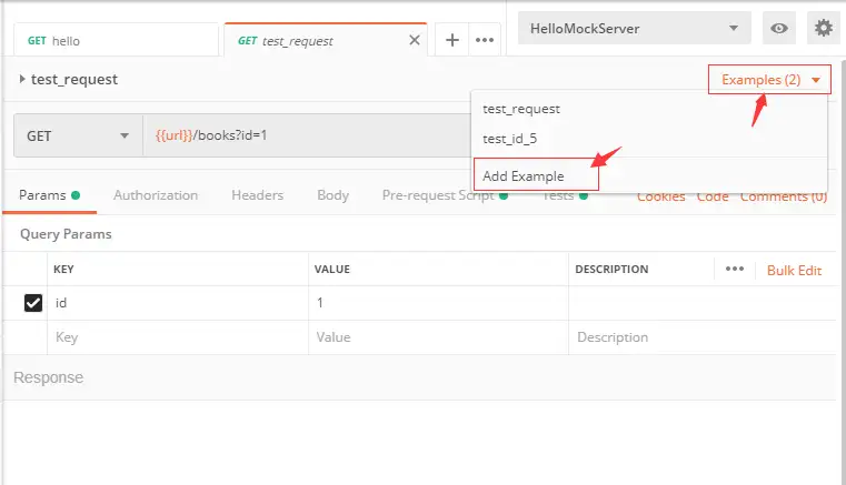 在创建 Mock 服务器时,可以直接选择接口集,按接口集创建。选择这种方式时需要提前给 mock 的请求添加样例,有两种添加 example 的方式: