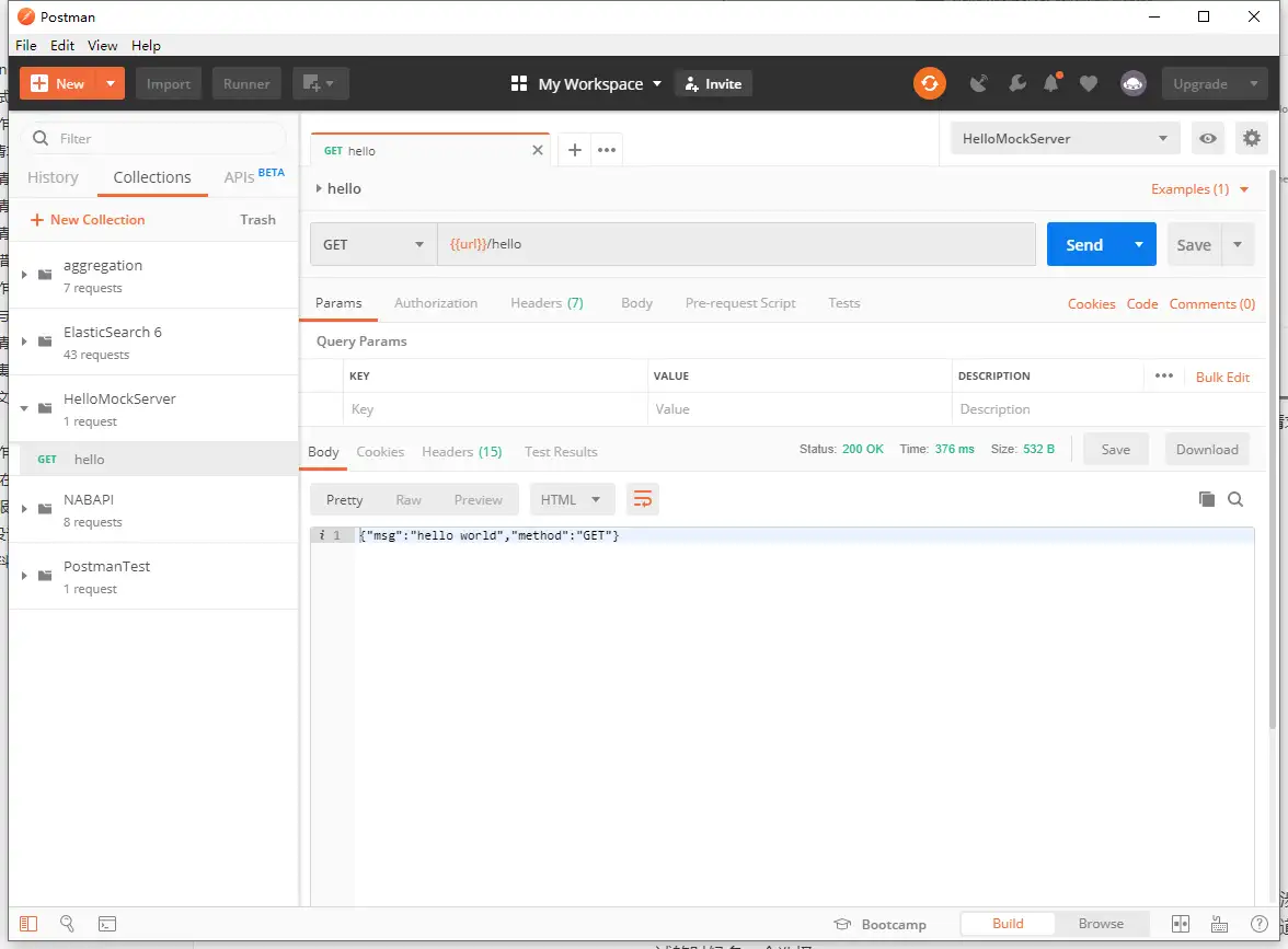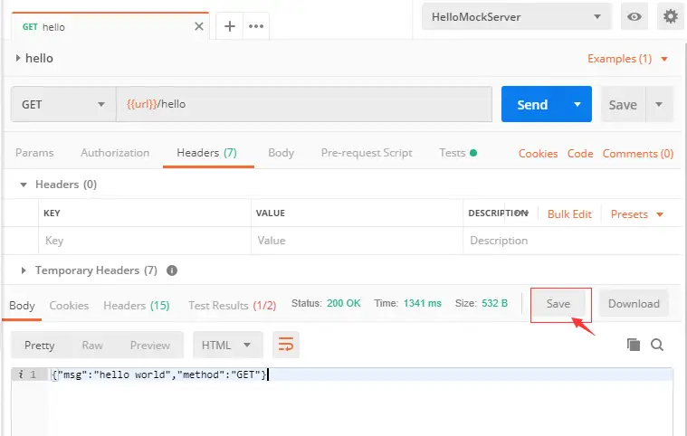 HelloMoceServer,选择刚才添加的/hello接口请求,设定环境为HelloMoceServer,发送请求,返回结果为我们设定的返回值。