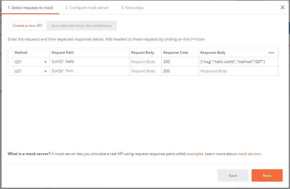 创建 mock 服务器时可以选择已有的接口集,也可以自己填入新的接口,我们在这里添加了一个