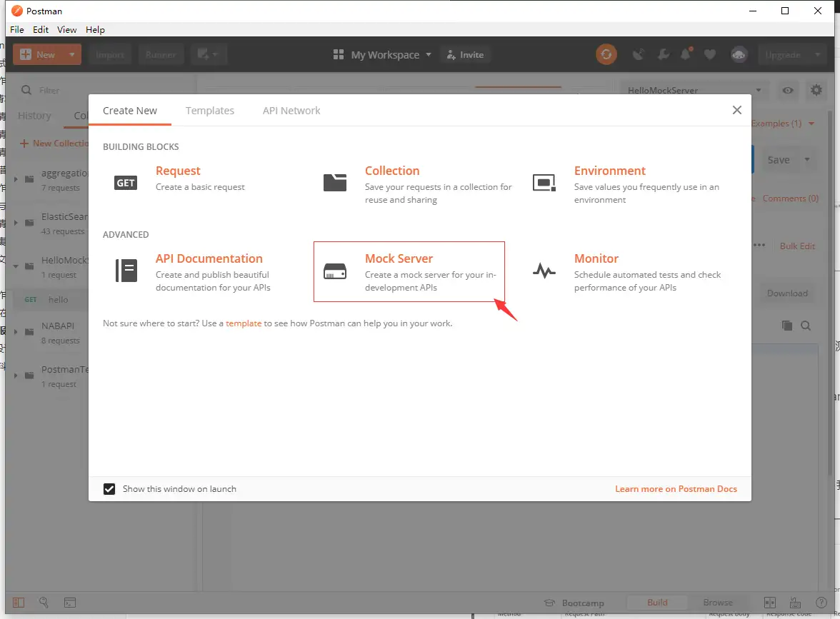 在 Postman 中可以使用 New 按钮、开始页面、Postman app、Postman API 创建模拟服务器。在这里我们通过点击 New 按钮,然后点击 Mock Server 选项来创建。