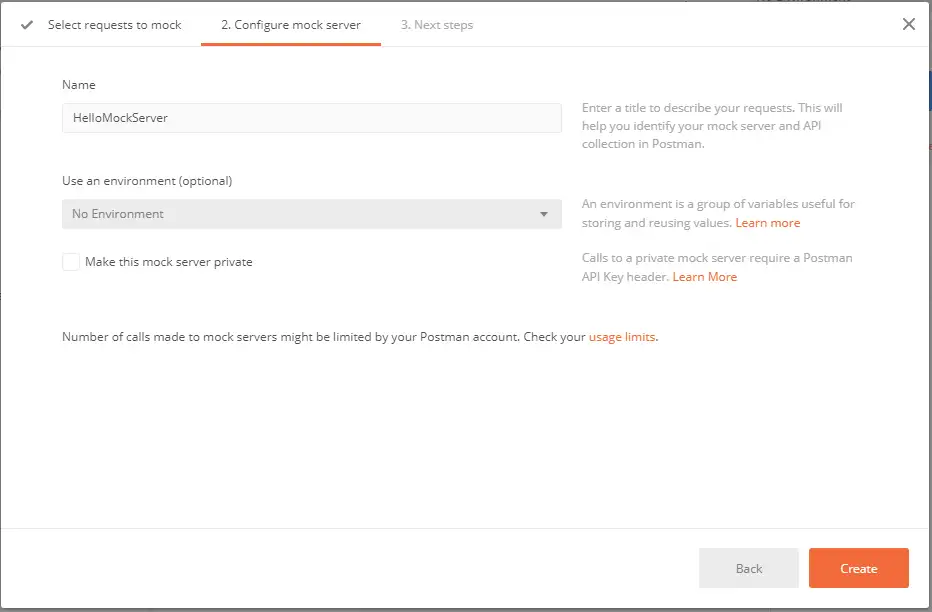 在配置页面填入服务器名称,选择运行环境,根据需要选择是否将服务器设置为私有,设置好后点击 Create 完成 mock 服务器的创建。