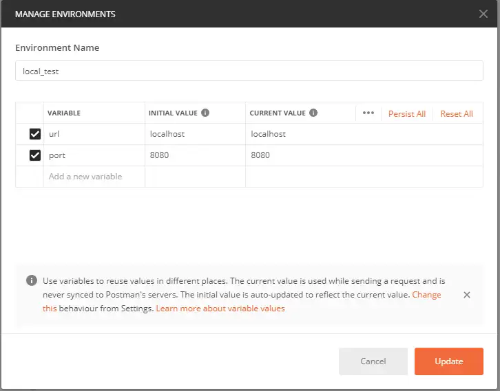 在测试接口过程中,在开发环境和生产环境中的请求地址、端口等参数可能有差异,Postman 中可以为每个测试环境创建一个环境变量集合,方便在不同环境下进行测试。