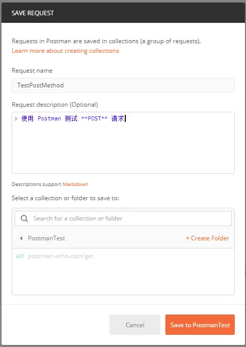 我们可以把接口测试请求保存下来,下次继续使用,只需点击 Save 按钮(快捷键 Ctrl + S) 即会弹出保存窗口,填入请求名称、描述,并选择或创建接口集后即可保存请求。