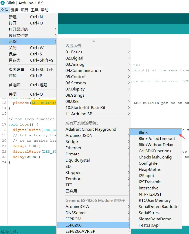 将 esp8266 接到电脑上,在 Arduino IDE 中选择 示例 - ESP8266 - Blink ,打开官方的点灯示例代码,上传到开发板后即可看到开发板上 LED 闪烁效果。