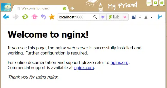 使用 docker 启动了 nginx 后,我们可以在浏览器中访问指定的映射端口(这里是 9080),访问地址 http://localhost:9080/ ,出现 nginx 的欢迎页面,说明容器运行正常。