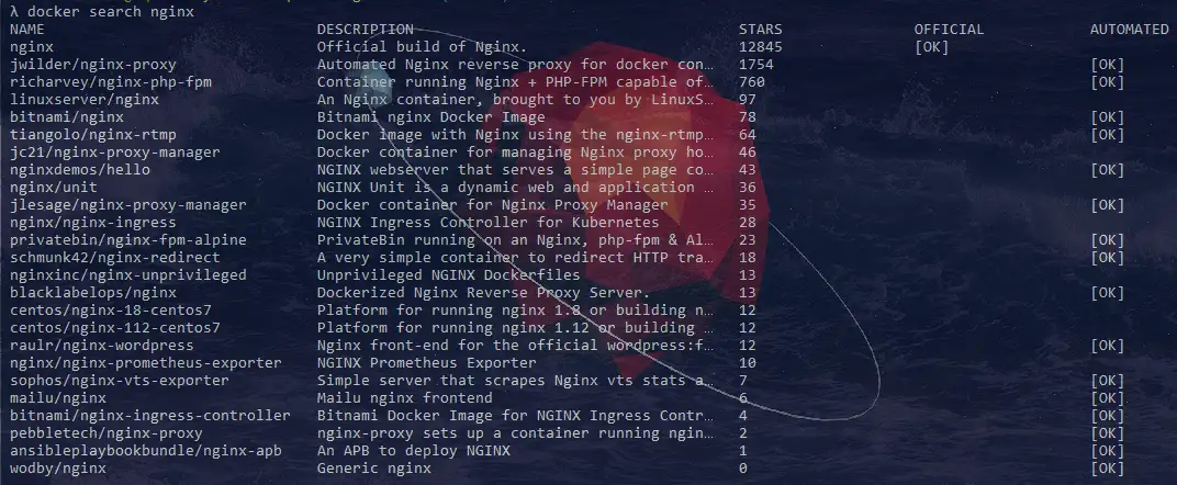 docker search 关键字 ,按关键字在仓库中检索镜像。如查找 nginx 镜像:docker search nginx