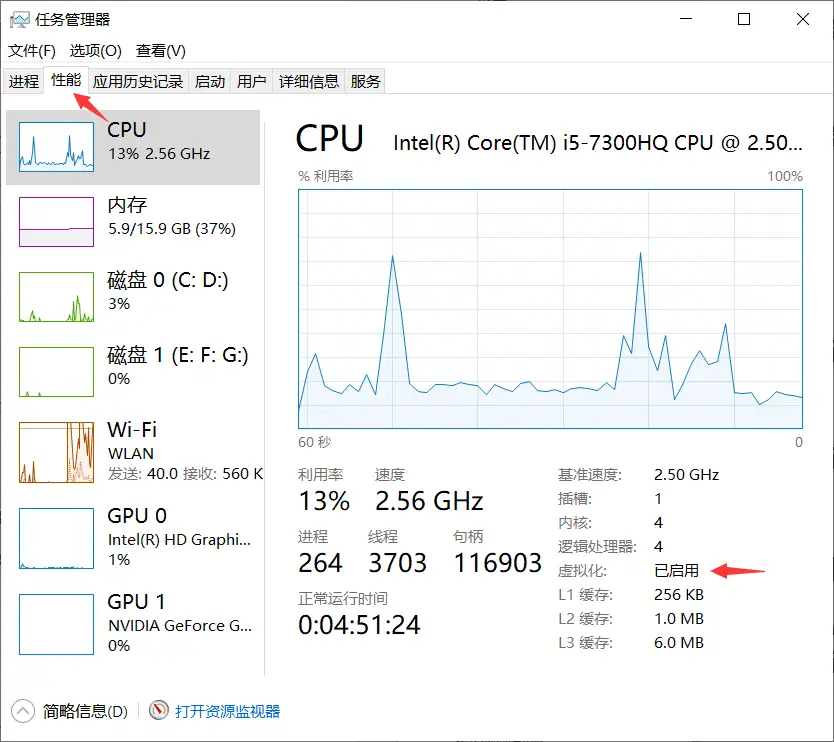 docker 需要使用到电脑的虚拟化功能,如果未开启这个功能,将导致 docker 运行失败。在 windows 10 电脑任务管理器中的 性能 一栏中可以看到是否启用虚拟化功能,如图: