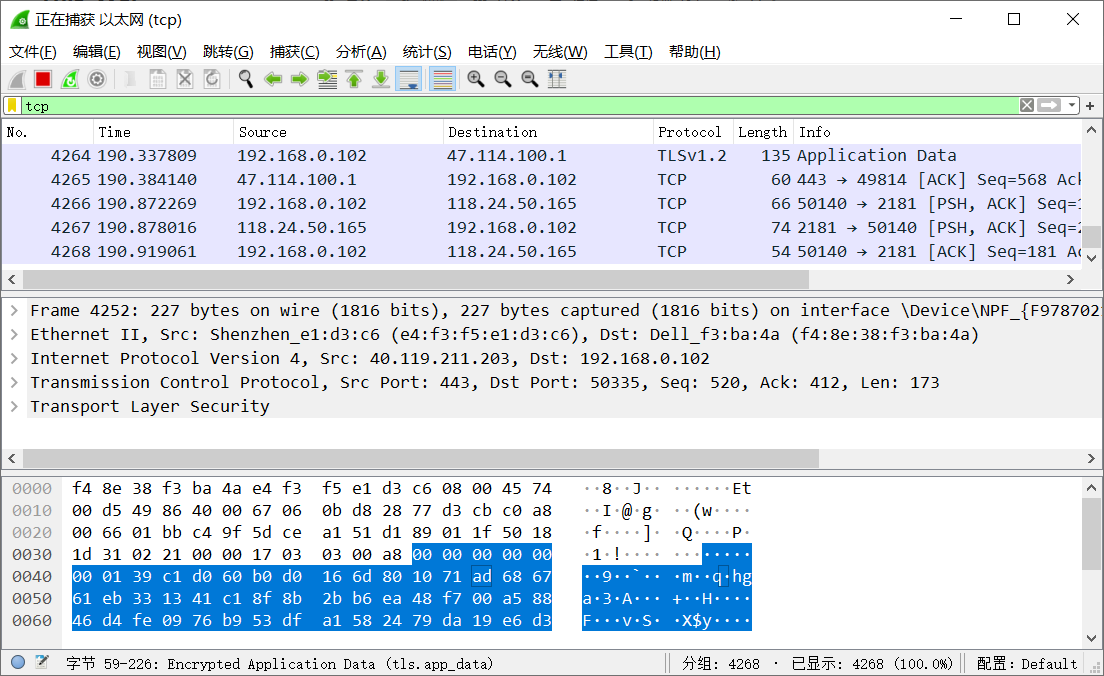 - 第三部分是报文内容,左侧以十六进制展示报文内容,右侧是尝试解析的结果。