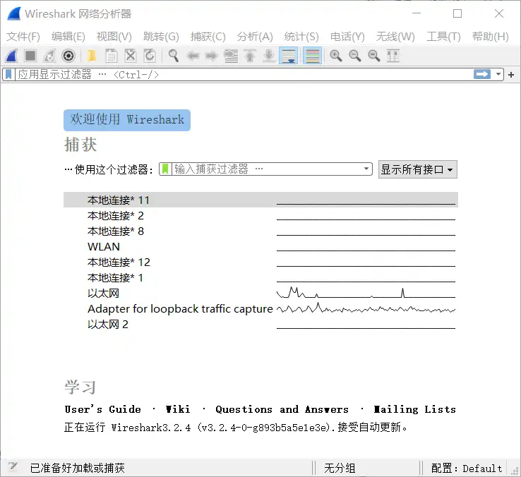 打开 Wireshark 后,界面如下所示,可以输入过滤器表达式限定要捕获的网络包,然后选择下方的网络进行抓包,直接双击即可开始。