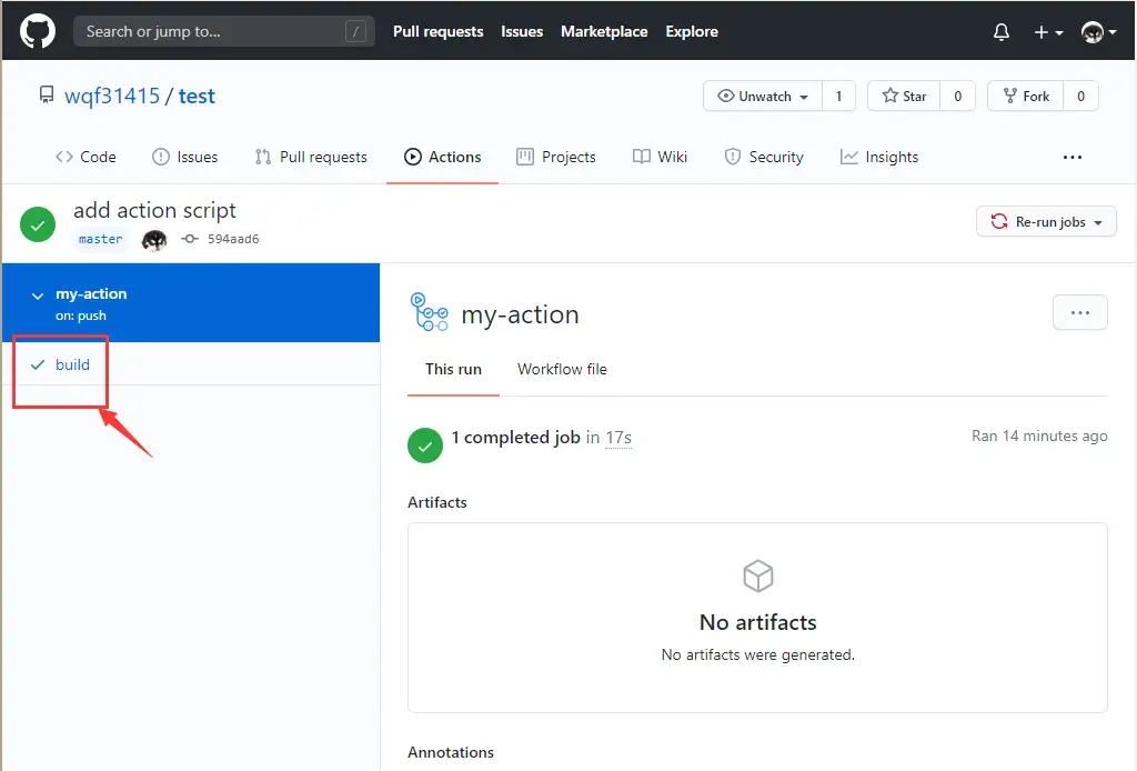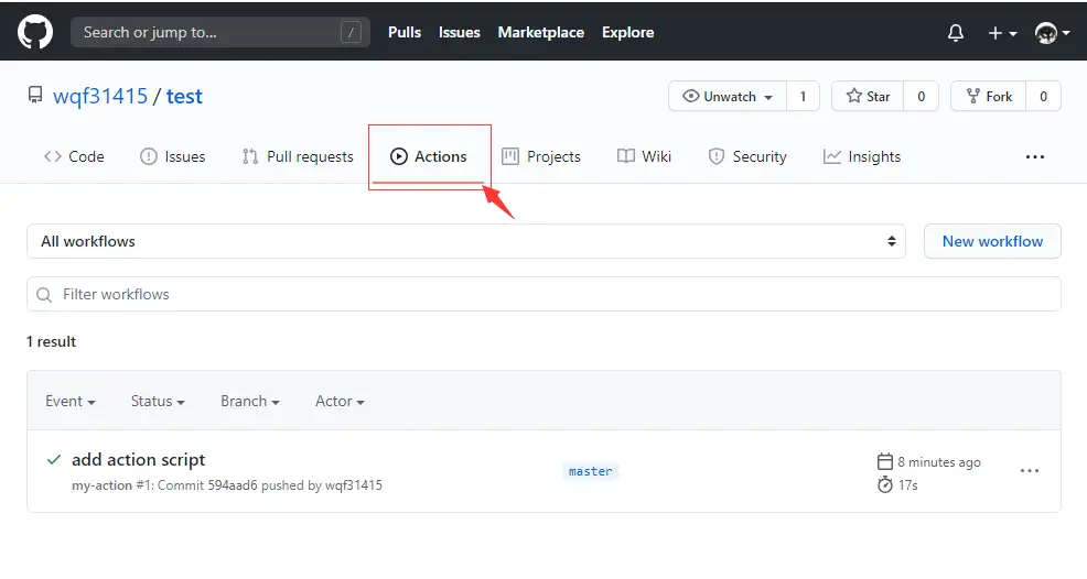 提交代码到 test 仓库的 master 分支,点击 Actions 标签,将展示工作执行结果: