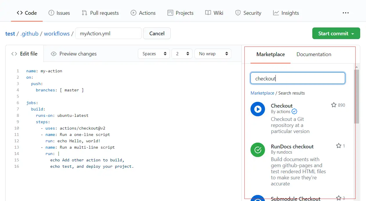 操作是一系列特定作业步骤的组合,可以完成特定的任务,可以创建自己的操作,也可以使用 github 社区分享的操作。比如使用官方的检出仓库的操作: