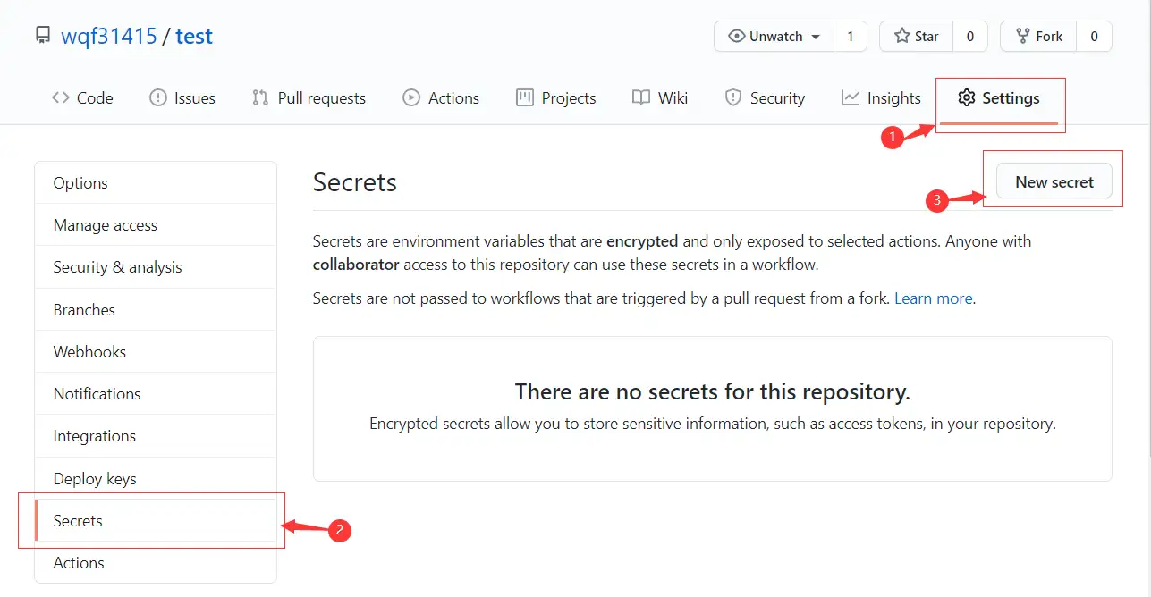 在构建与部署过程中,我们可能需要用的一些加密信息,这时我们需要在仓库设置中添加加密信息,需要输入名称和值。