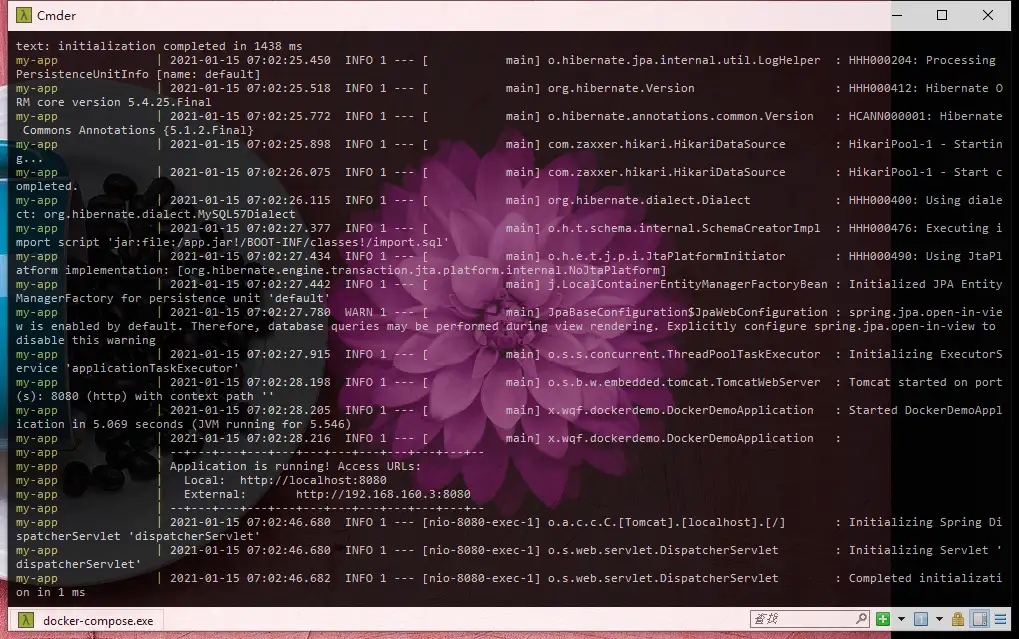 如果数据库容器启动太慢,在应用容器启动时还未启动,将导致应用容器启动失败,这时可以再次尝试使用 docker-compose 启动。