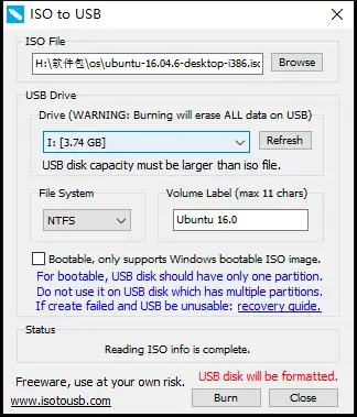 安装系统时需要先将系统镜像写入U盘,这里使用 ISO to USB 工具进行刻录。