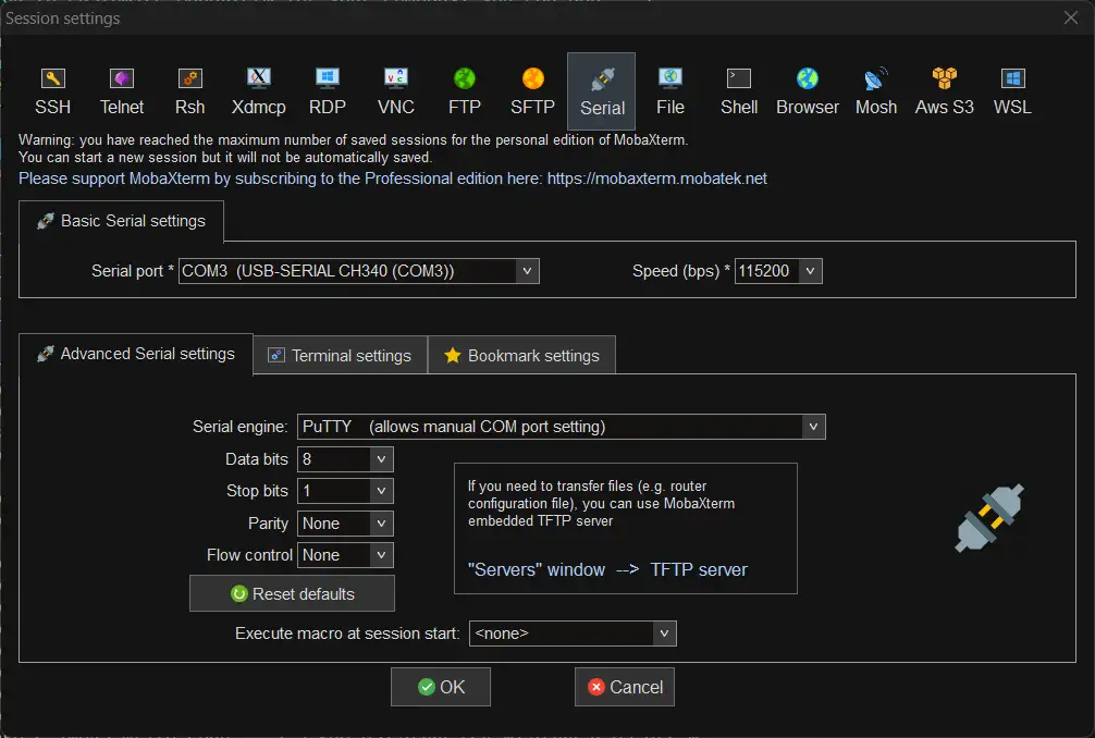 连好线后将 USB 转 TTL 模块插入电脑,打开 MobaXterm ,新建 Session 选择 Serial 串口类型:
