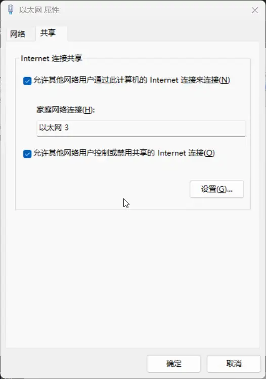 勾选 “允许其他网络用户通过此计算机的 Internet 连接来连接”,在“家庭网络连接”下拉框中,选择第一步中识别出的、代表Luckfox Pico的那张虚拟网卡(例如我的是“以太网 3”)