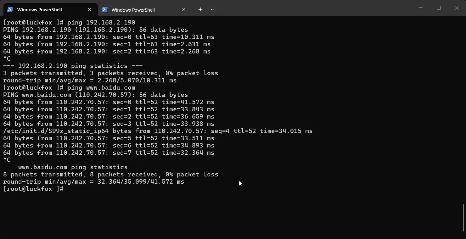 注意:这种方式配置的 IP 会在重启后失效,如果需要持久化,需要编写开机启动脚本,参考官网教程自启动配置 | LUCKFOX WIKI,在系统启动时自动修改IP配置: